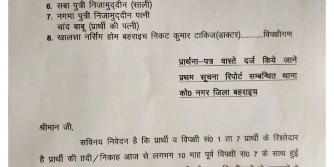 बहराइच।नगर के थाना दरगाह शरीफ के मोहल्ला मंसूर गंज निवासी चांद बाबू पुत्र स्वर्गीय हाफ़िज़ खलील अहमद ने पुलिस अधीक्षक को प्रार्थना पत्र देकर नाजिर पुरा कोतवाली नगर निवासी (1) निज़ामुद्दीन पुत्र अज्ञात (ससुर),(2)फूल जहां पत्नी निज़ामुद्दीन (सांस),(3)साहिबे आलम पुत्र निज़ामुद्दीन (साले),(4)शानु पुत्र निज़ामुद्दीन (साले),(5) नर्गिस पुत्री निज़ामुद्दीन (साली),(6)सबा पुत्री निज़ामुद्दीन (साली),(7)नगमा पुत्री निज़ामुद्दीन (प्रार्थी चांद बाबू की पत्नी),(8)खालसा नर्सिंग होम बहराइच निकट कुमार टाकिज के डाक्टरों पर नवजात शिशु की हत्या का आरोप लगाया है चांद बाबू ने कहा है कि मेरी शादी नगमा से 10 माह पूर्व हुई थी कुछ दिन नगमा अपने ससुराल में रही और अपने घर वालों के बहकावे में आकर अपने मामू अनीस के साथ मायके चली गई थी और वह अपने मायके में ही रहती थी जब पत्नी अपने मामू अनीस के साथ गयी थी तब वह लगभग 5 माह की प्रेगनेंट थी पति ने पत्नी नगमा को अपने घर लाने के लिए केई बार रिश्तेदारों द्वारा पंचायत की गई और रुखसती का दावा न्यायालय द्वारा दायर किया गया मगर पत्नी अपने मायके वालों के बहकावे में आकर अपनी ससुराल नहीं आई पति चांद बाबू ने अपनी पत्नी के पेट में पल रहे बच्चे को ससुराल वालों द्वारा षड्यंत्र कर जन्मे बच्चे की हत्या का आरोप लगाया है